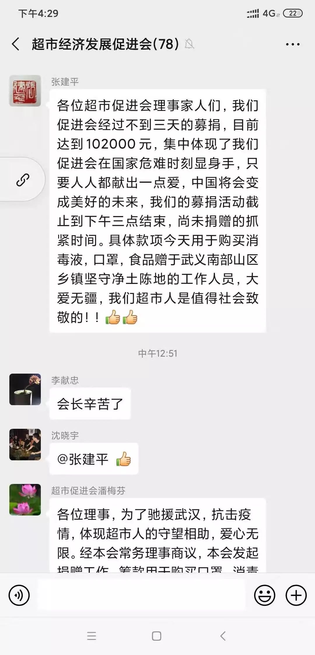 为了驰援武汉,抗击疫情,武义县商会副会长、武义县超市经济发展促进会会长张建平在微信群里发起了爱心接力,经过不到三天的募捐,筹集了10.6万元爱心款,准备购买消毒液、口罩和食品用于疫情防控。面对疫情,他号召全体会员,作为一名零售人,要保障门店卫生安全、员工和顾客防护;要坚守一线保障货品供应,绝不涨价;拒卖野味,保障食品安全……